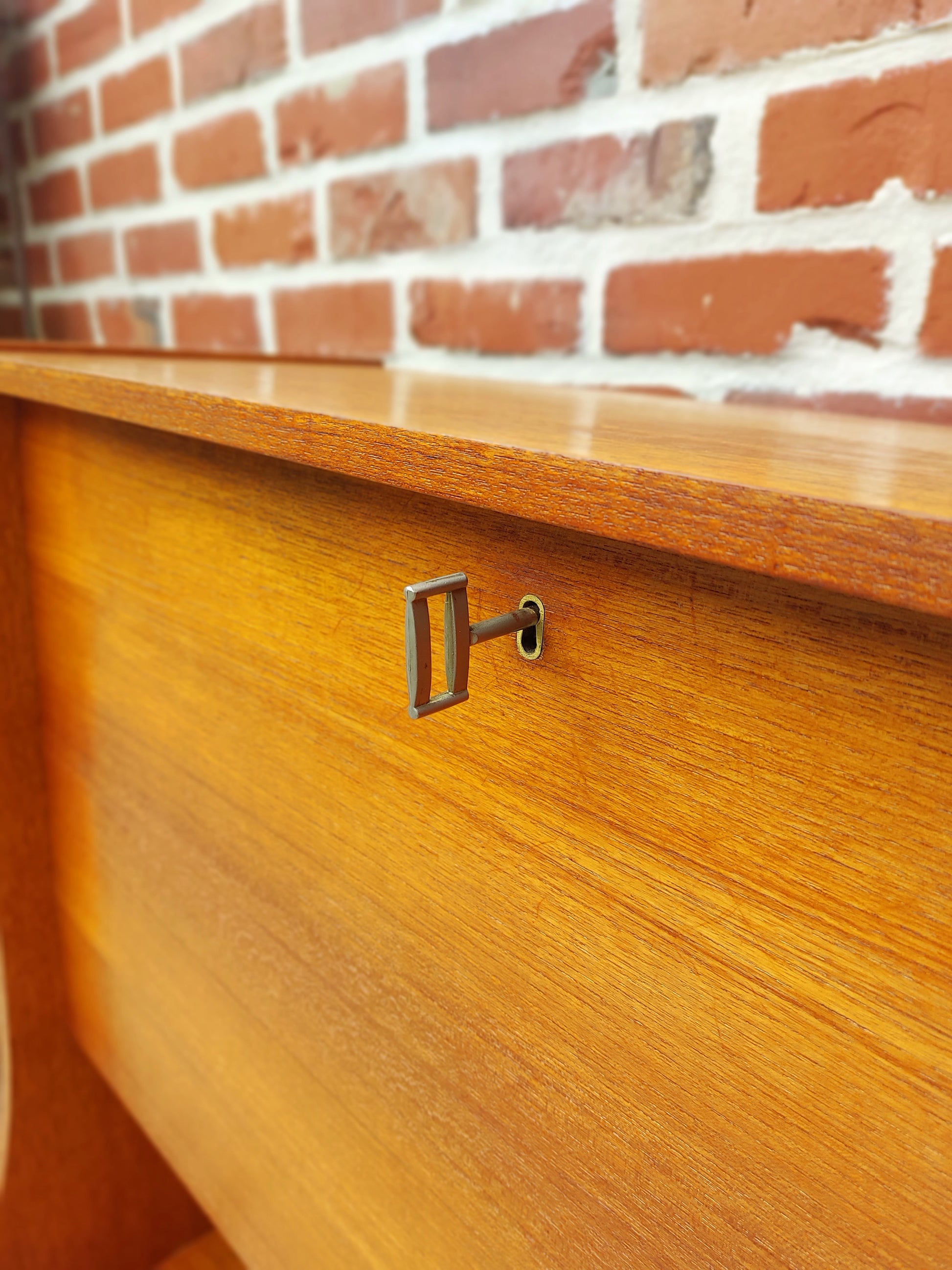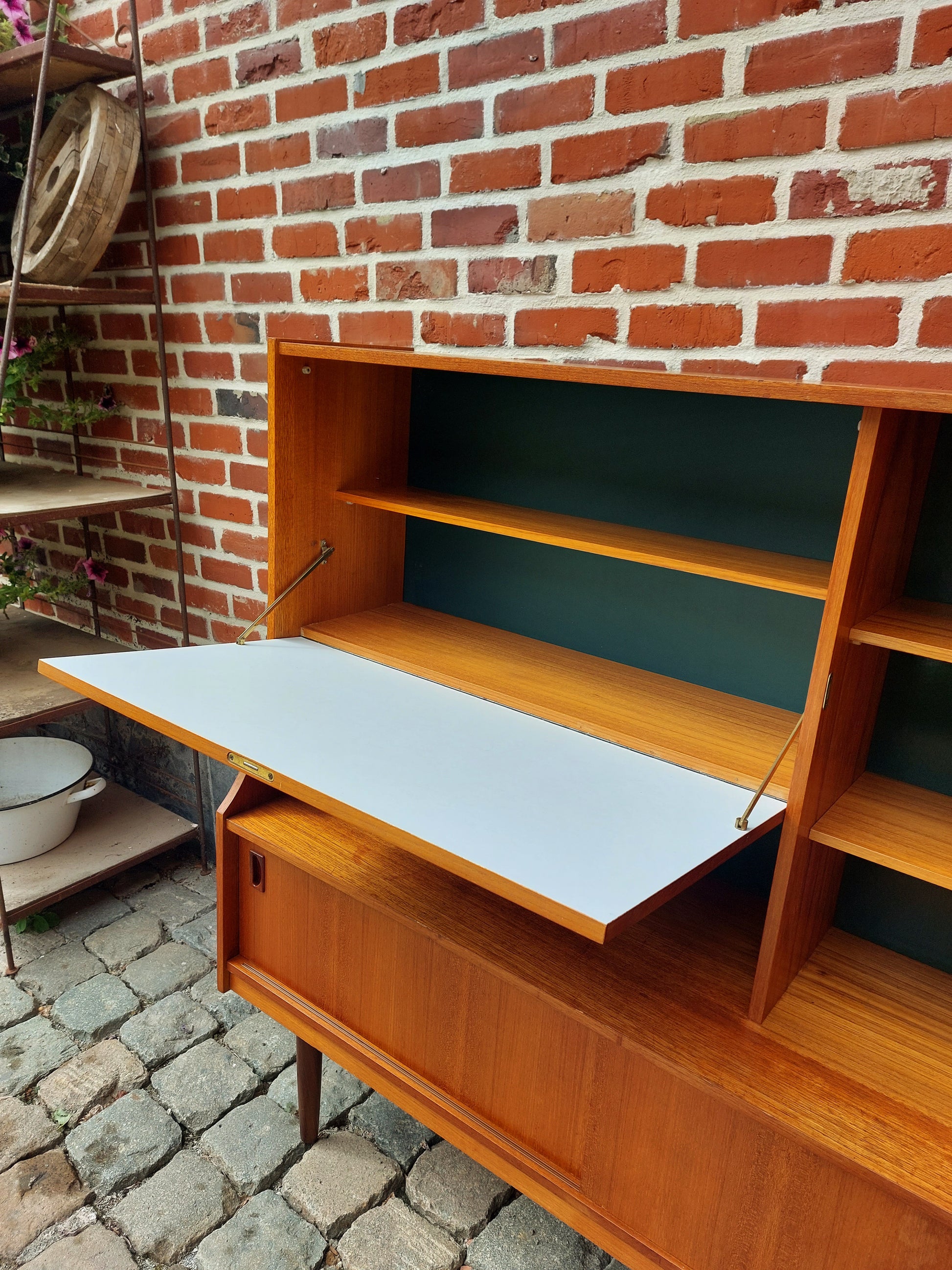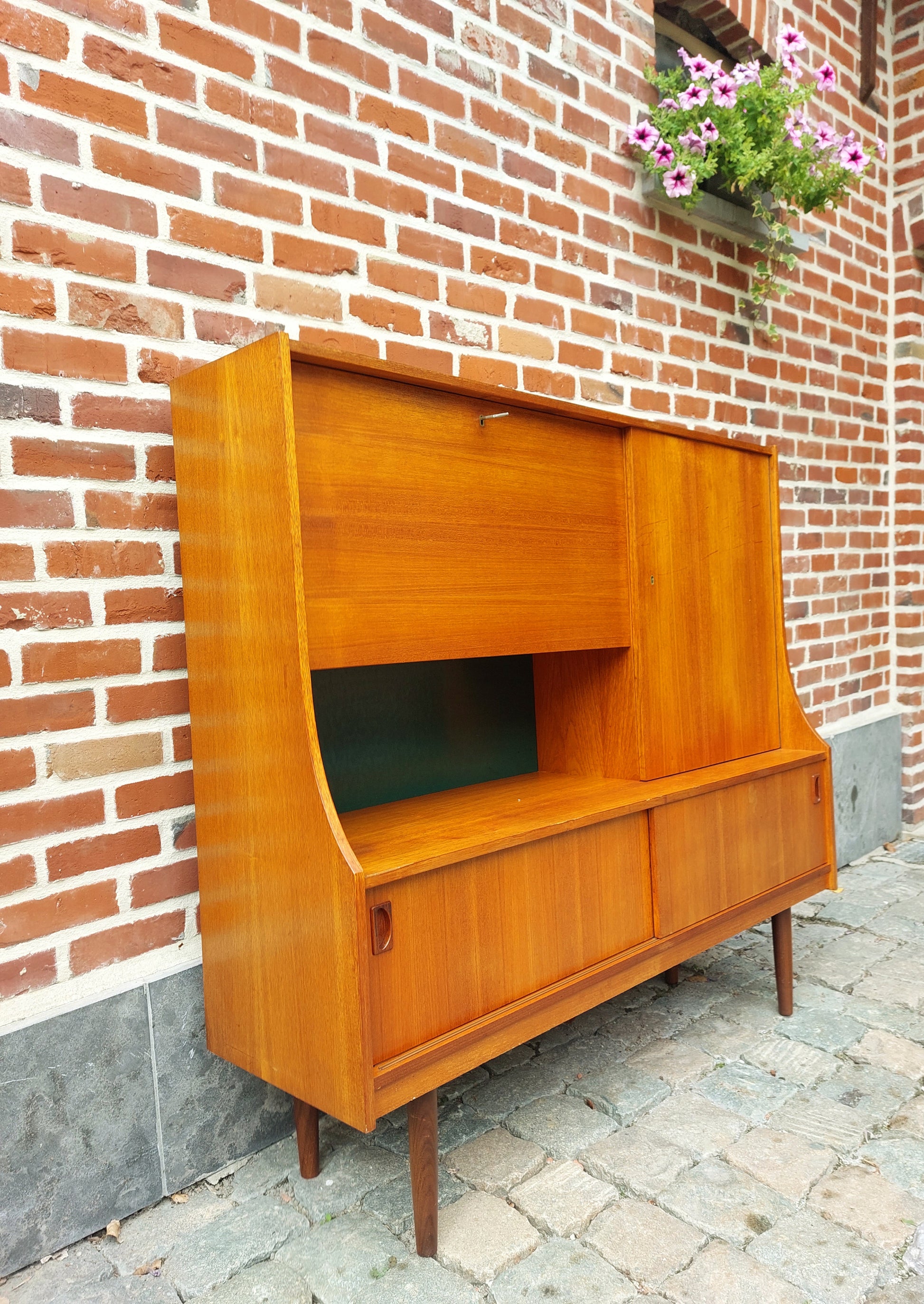 Mooie Deense barkast met milde gebruikssporen. Deuren en schuifdeuren gaan vlot open en dicht. Rechts onderaan is er lade. Strak design met heel wat opbergruimte.