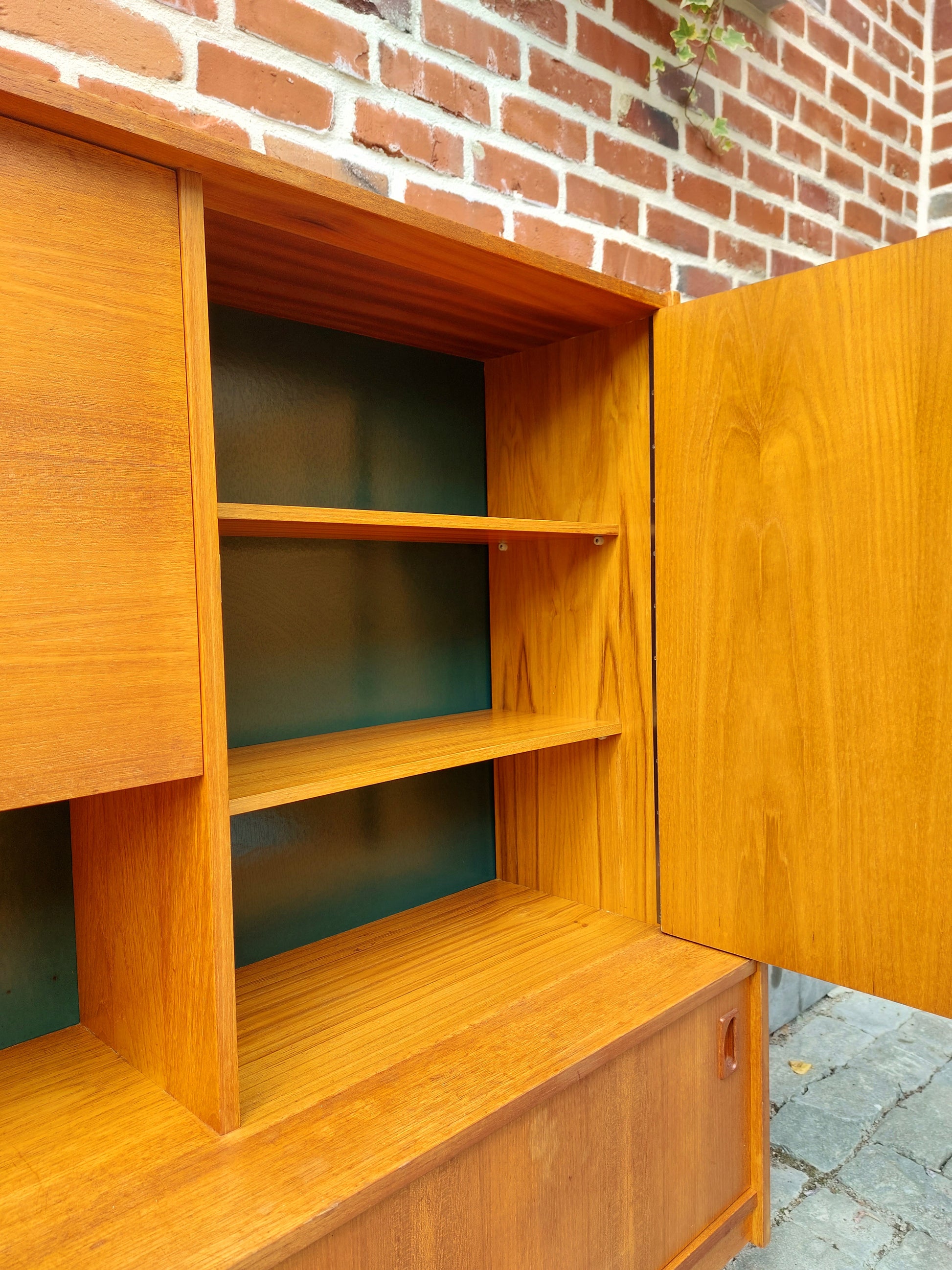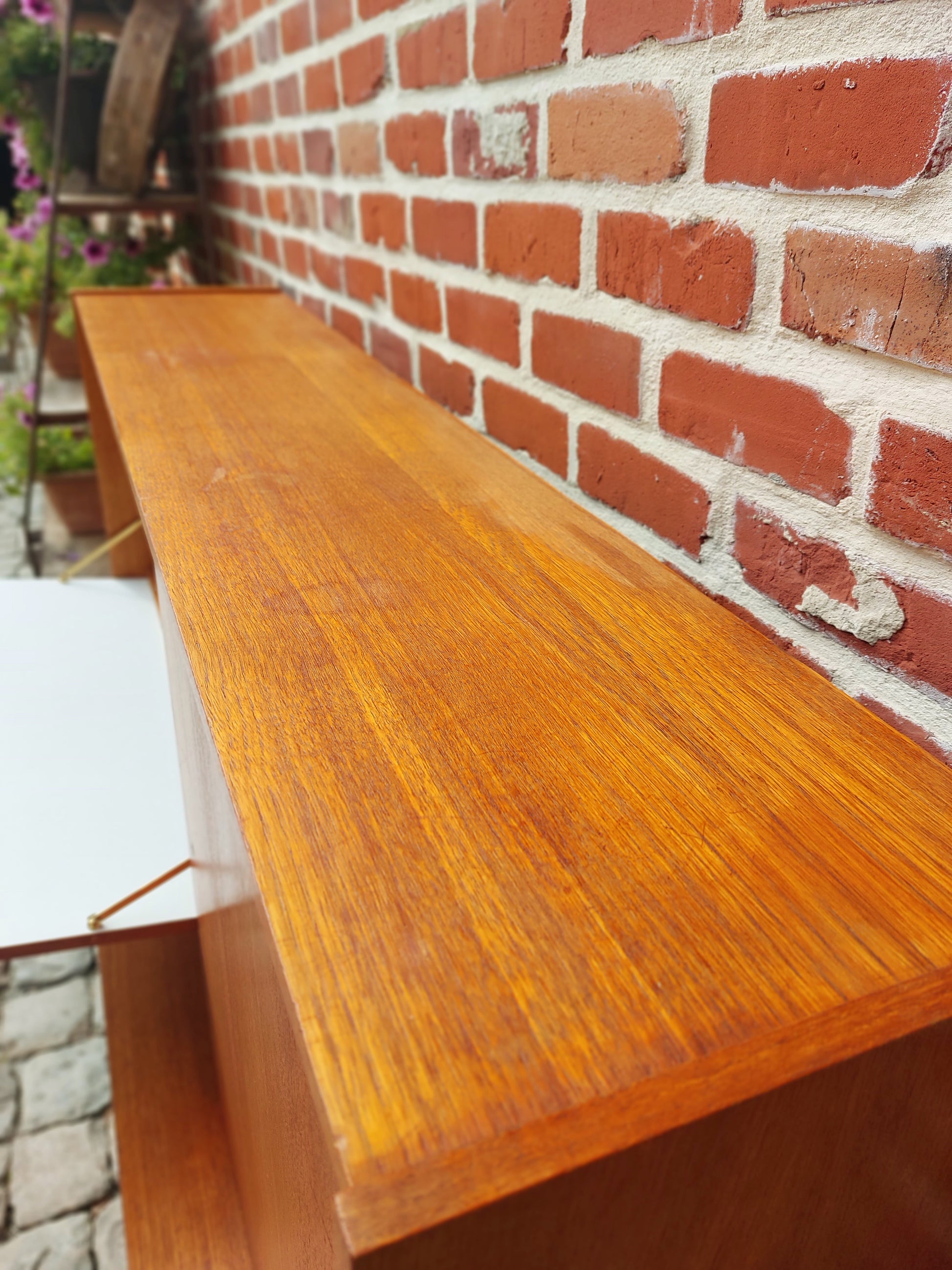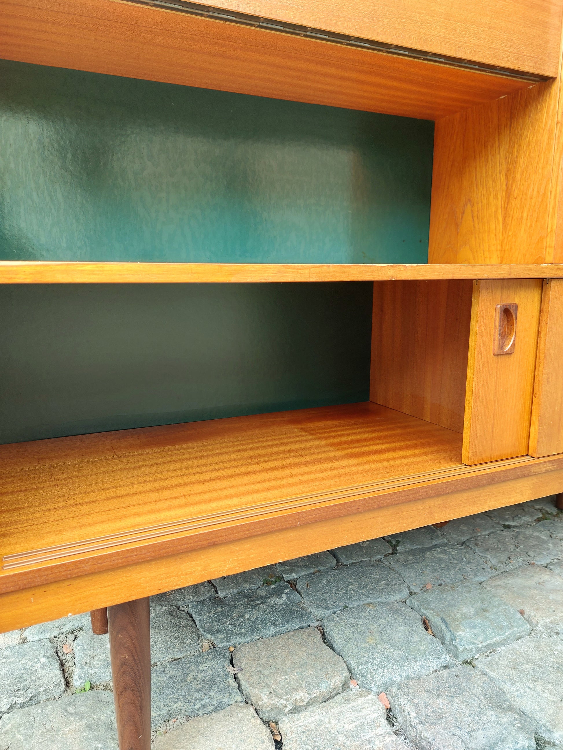 Mooie Deense barkast met milde gebruikssporen. Deuren en schuifdeuren gaan vlot open en dicht. Rechts onderaan is er lade. Strak design met heel wat opbergruimte.