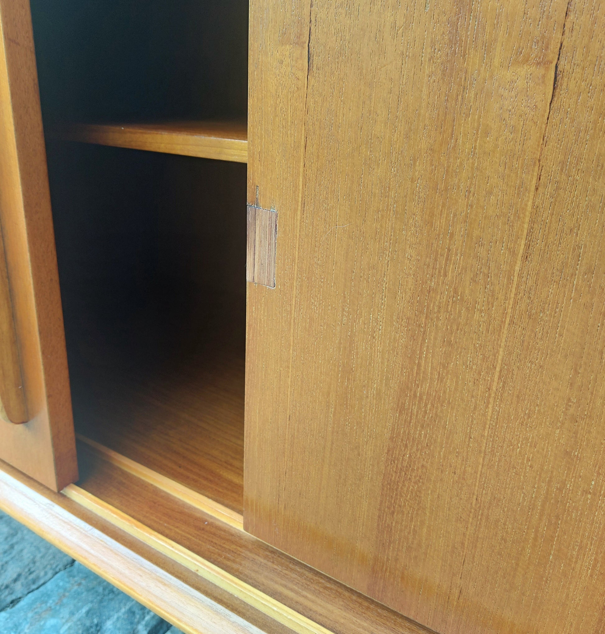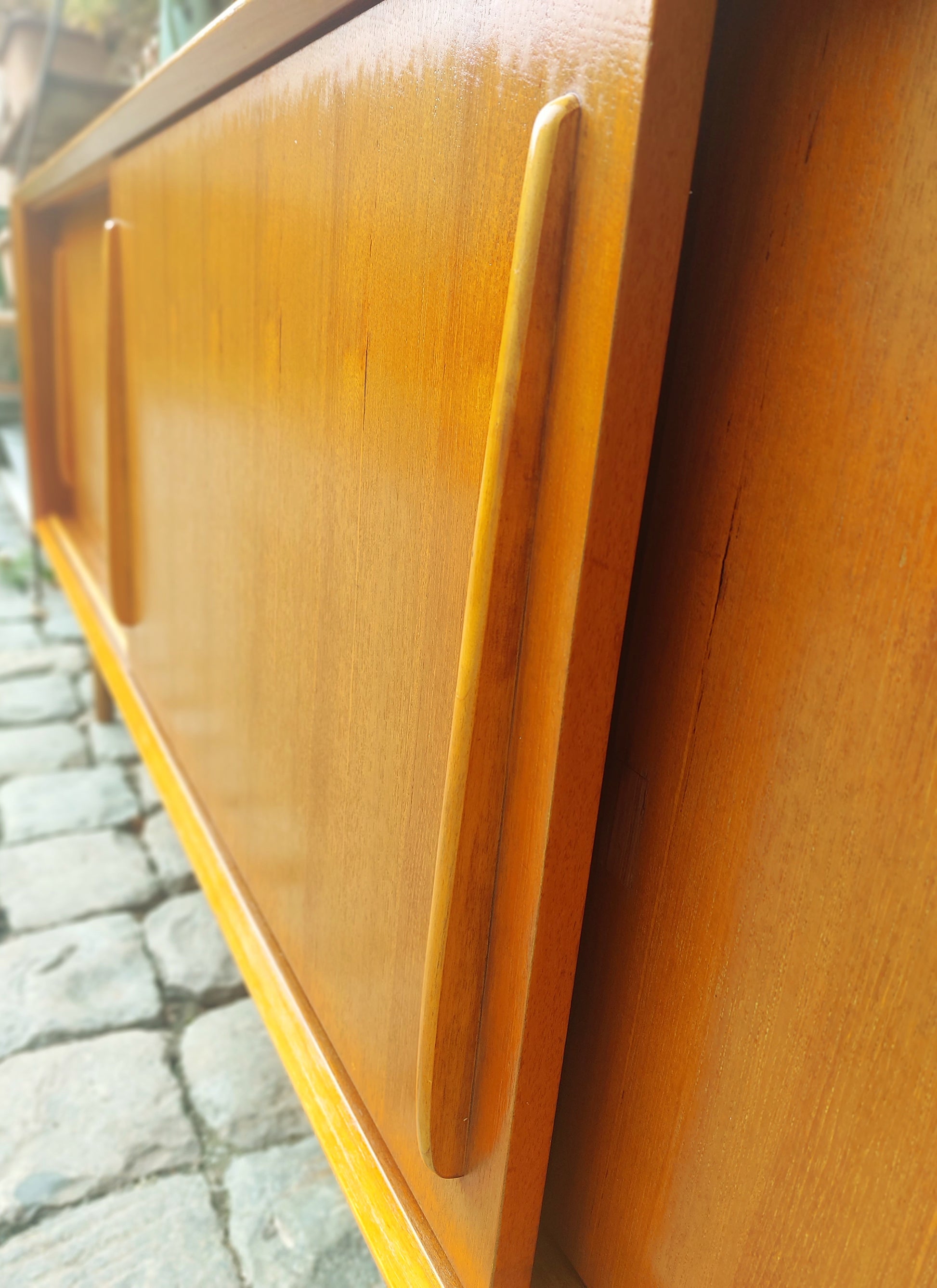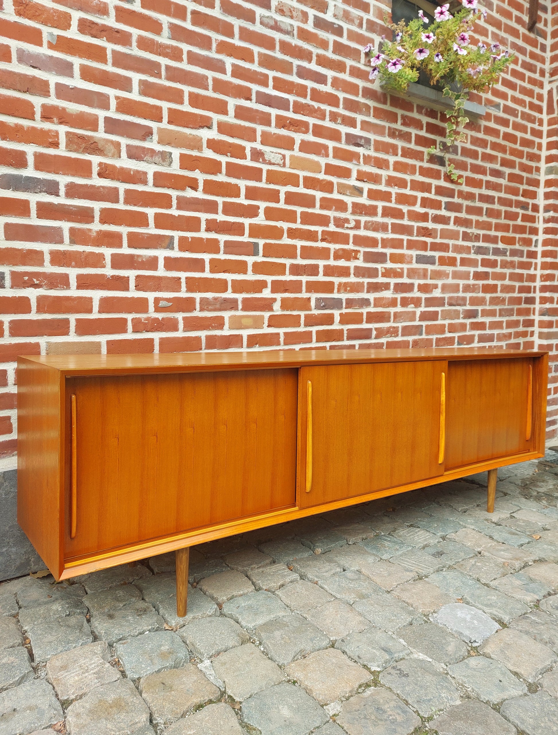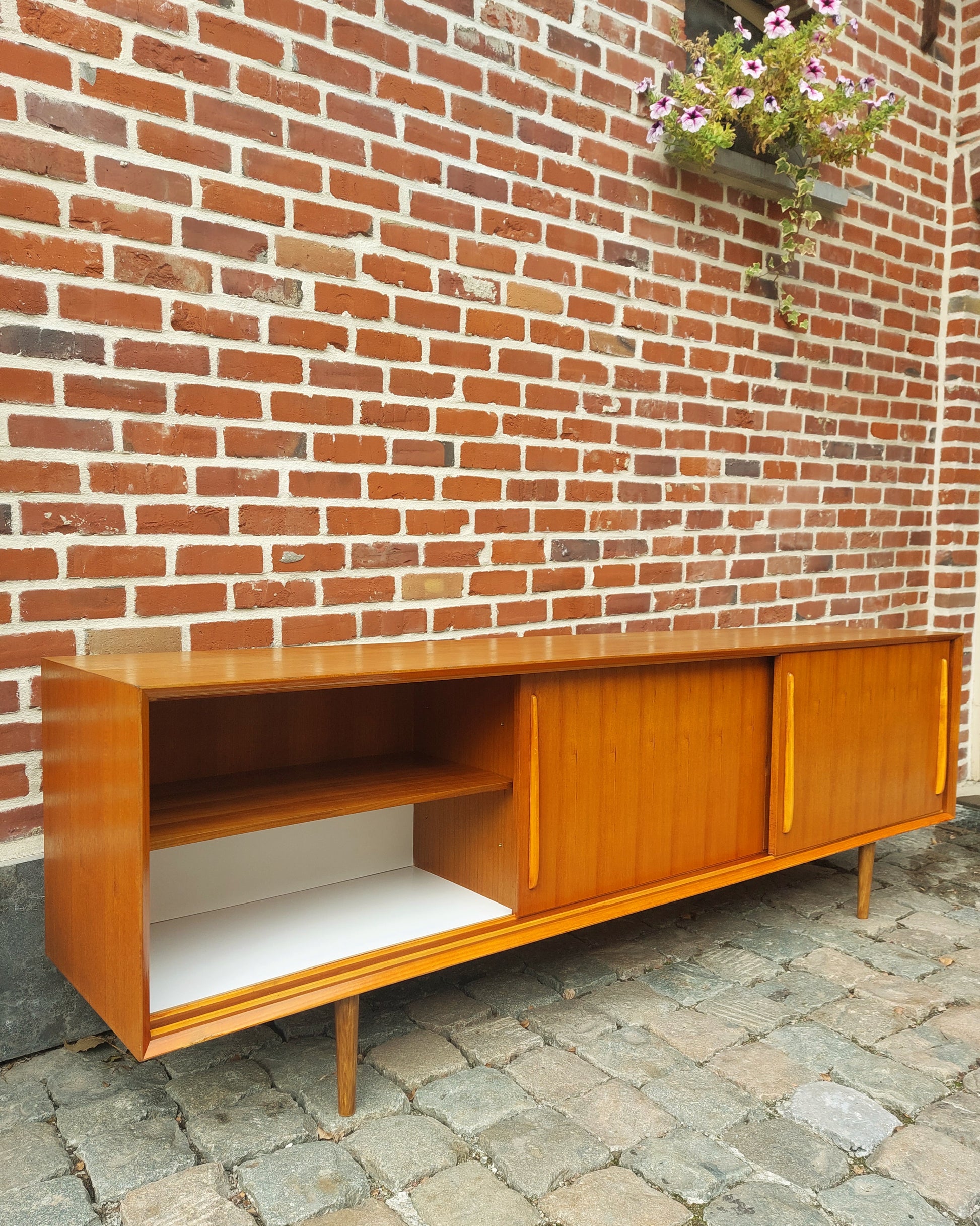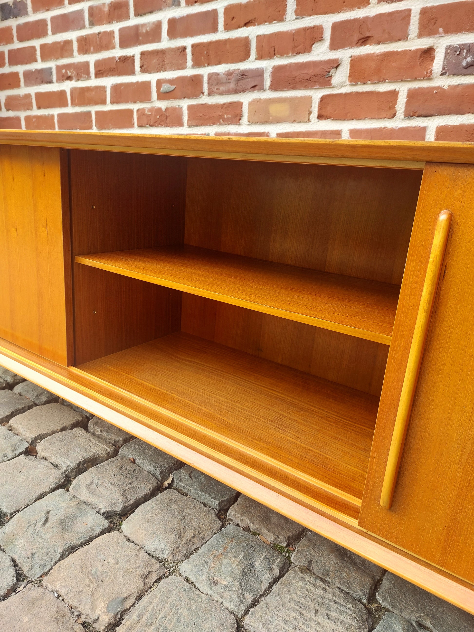 Vintage XXL lowboard in mooie staat. Strak design met veel opbergruimte. Schuifdeuren gaan vlot open en dicht. Kleine herstelling aan het fineer van de rechtse deur, niet zichtbaar als de deuren dicht zijn.